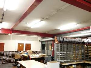Amateur Motorcycle Cycle Association or AMCA asked us if we could sort out there print room as all the old fittings were failing or not producing light, but still using power. We said not only can we fix the lighting but save money in the long term on the electricity bill. Day and Knight electrician Cannock got John from the energy saving showroom to specify and calculate how much light they need and how many fittings they needed. Then all the lights were removed and Safely disposed of. The new energy efficient lights were installed as you can see by the photos the result is impressive. Saving money on fluorescent lights in your commercial property is simple.