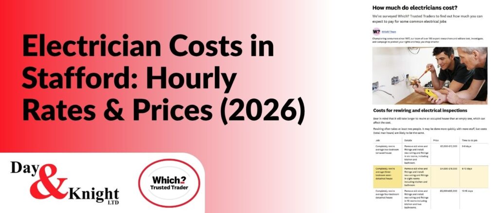As electricians based in Stafford, Day & Knight are here to help you figure out roughly how much an electrician costs for small, medium and large electrician jobs. As a Which? Trusted Trader, it’s in our best interests to stay informed on electrician prices so we can keep your electrical project compliant and within budget.