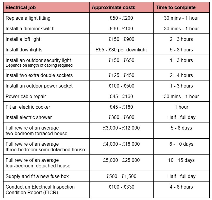 - Cost breakdown for typical electrician jobs, small all the way through to larger projects
