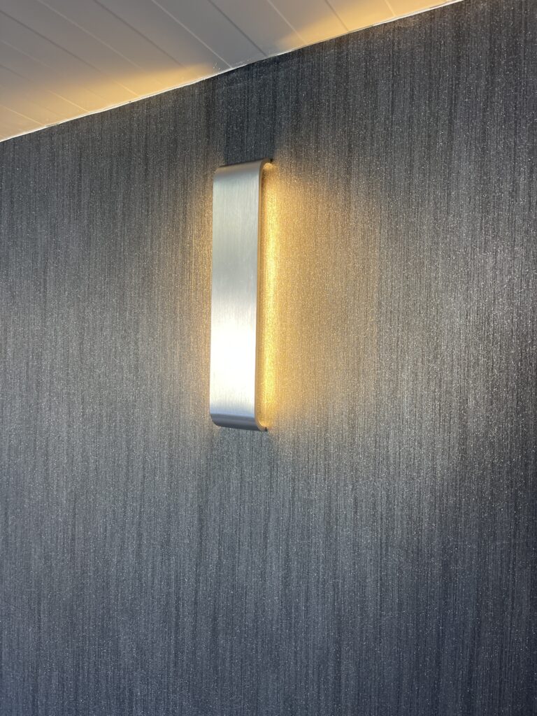 LED wall lights in a matte black finish, chosen to echo the modern, minimalist look of the office. These lights are not only energy efficient but also provide a beautifully even glow—ideal for working late into the evening.